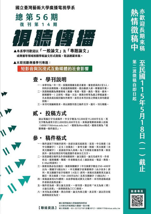 【第56期《視聽傳播》學刊第二波徵稿訊息,歡迎專家學者來稿、轉載及分享相關資訊】