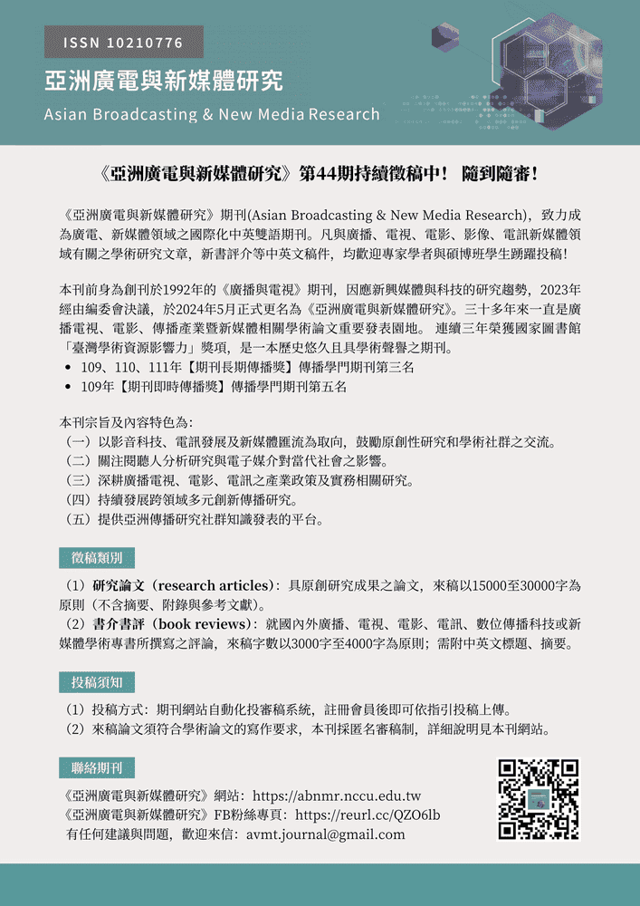 《亞洲廣電與新媒體研究》網站:https://abnmr.nccu.edu.tw